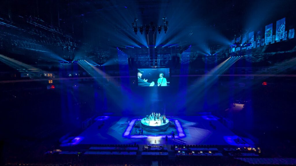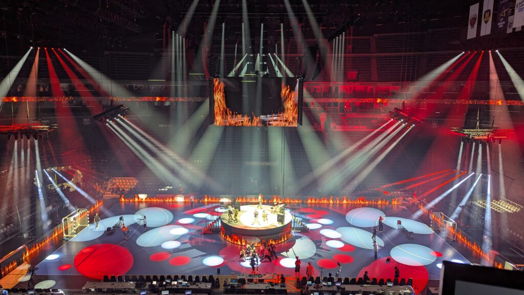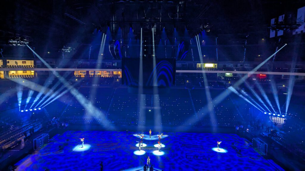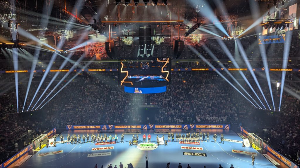 Looking back at all the projects that happened, the European Handball Final (EHF) in the Lanxess Arena in Cologne was one of my biggest so far. Maurin from ProdLive contacted me very early in the year to ask if I was interested in designing a lighting rig for five halftime shows. At first, it was just for a pitch to give the client a feeling of what could be achieved with modern lighting systems. In the end, the client booked the whole package, including a large floor set, six standardized frontlight trusses, and four movable effect pods. Even for me, this was a big surprise and something nobody had thought would happen.
